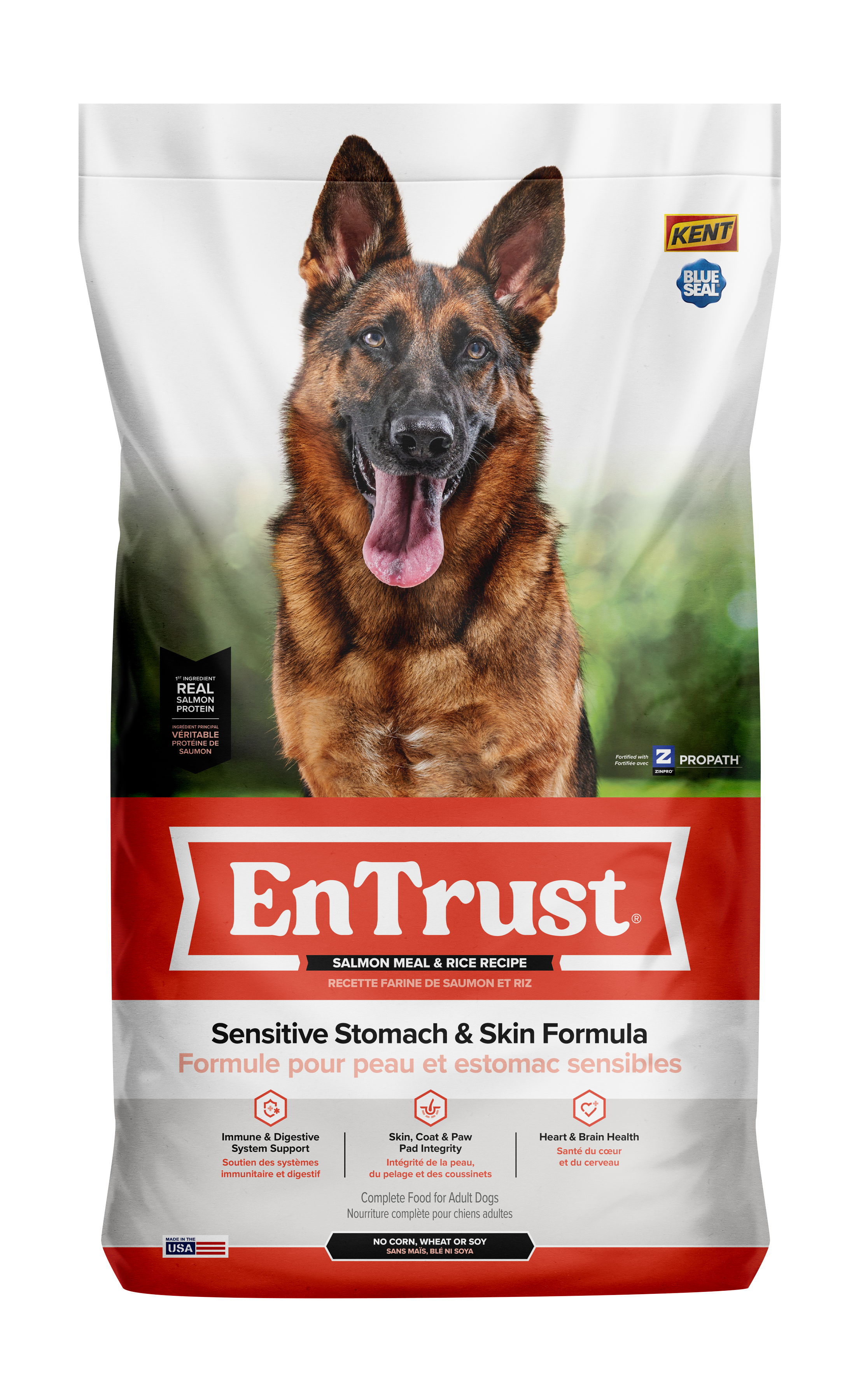 EnTrust® Sensitive Stomach & Skin Formula Salmon Meal & Rice Recipe is specifically formulated complete nutrition featuring highly digestible salmon protein and moderate levels of fat to support an ideal body condition for adult dogs. This no corn, no wheat and no soy formula is a great choice for dogs with food sensitivities. See all the new features and benefits it has to offer.